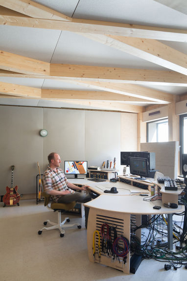 The new recording studio is designed as exemplar acoustic environment. Built like an onion, the construction is a series of layers of different materiality and density, each separated with resilient connections. The inner most layer is structural, with a glulam diagrid organised around the axis of acoustic symmetry which sets out the plan. During construction a WWII bomb shelter was unexpectedly uncovered, part of which is integrated into the recording studio.