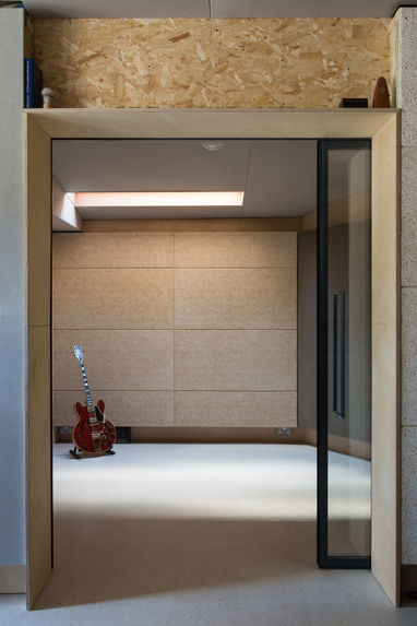 We worked closely with the client and Kahle acoustics to define a material palette comprising principally natural materials, including sheep’s wool, wood wool, and recycled denim insulation. The glulam structural frame, is completely decoupled from the ground for acoustic reasons, sits on a series of rubber resilient pads. The frame was prefabricated off-site and installed over 3 days by a small team.