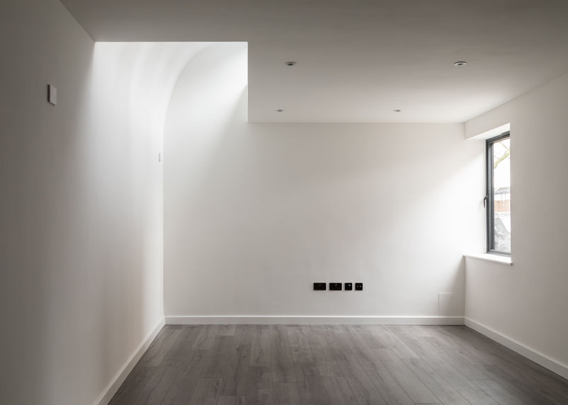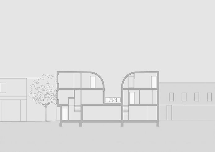 The project comprises two houses within this curved massing, a two bed and a three bed town house. Both houses are organised over three floors with one principle room per floor. Despite their proximity, the two houses feel quite distinct from each-other, both entered through different streets, and both enjoying secluded private amenity spaces.